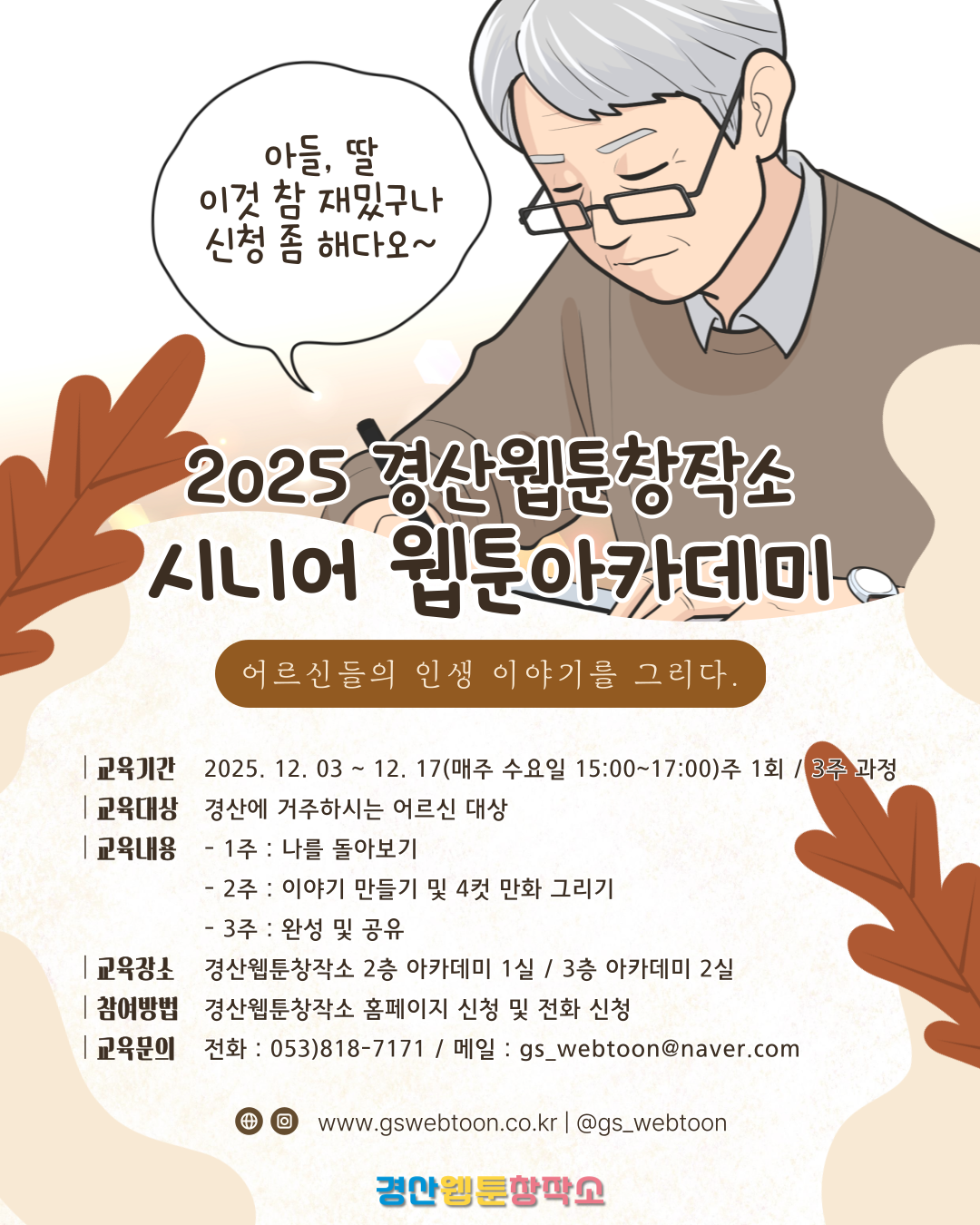 - 장소 : 경산시 장산로 24길 16 경산웹툰창작소 아카데미1실 (2층)