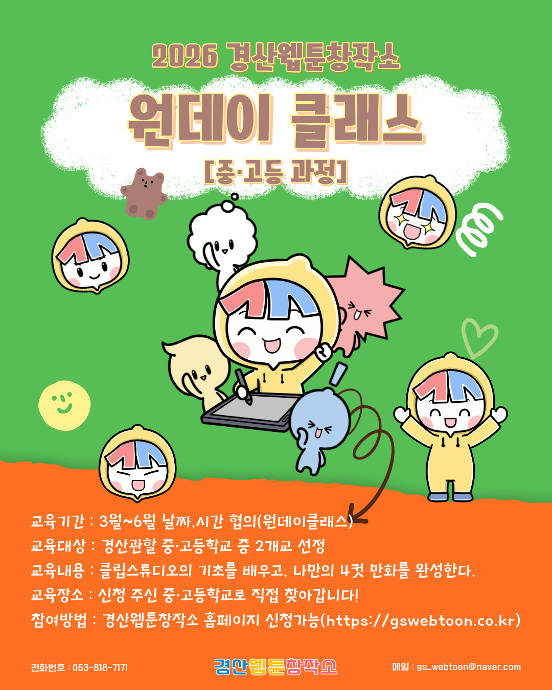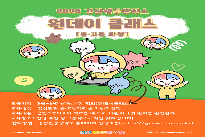 - 강사 : 메인강사(만화경력 10년 이상), 보조강사(만화경력 1년 이상) 각 1명씩 배정
